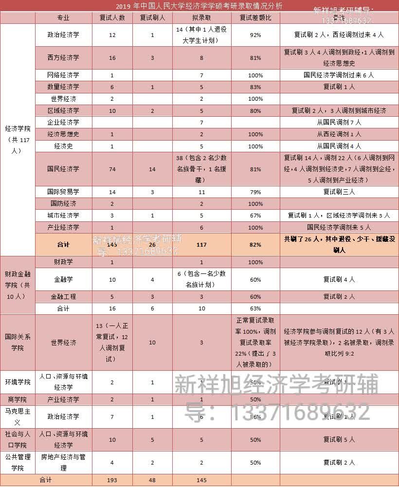 2019年中国人民大学经济学学硕各专业,进入复试193人(包含调剂的统计在内,剔除了被经济学院录取还参与国关调剂的人数,经济学院内部调剂的不算在内),最终录取145人。
