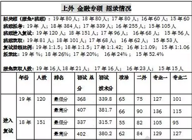 因为金融专硕是近两年新开设的专业,2015年9月份,第一届学生开始授课。所以,现在目前为止有三届的报录比信息。而第一届因为是第一次开设,知名度甚低,因此报录比非常的高,其指标没什么参考价值。另一方面,我们可以看到全国统考报考人数逐年增加,16年是三百多人,17年增加到四百多人,但招生人数并没有扩招,可以说竞争还是比较激烈的,所以大家一定要在初试的时候拿到高分,特别是专业课和396成绩。