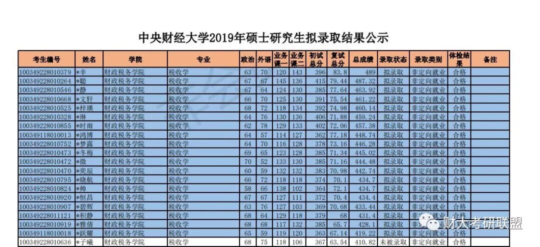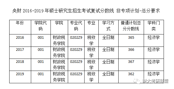 以上是央财税收学19年的录取情况及近几年的复试总分线,均为除去推免生的数据。今年分数线划在了362分,比国家线高了17分。从今年的录取名单中能看到,平均成绩为383分,录取成绩有高有低。还是那句话,复试成绩很重要。通过最近四年复试线的对比,可以看到复试线在360到370之间波动,2020年也不会有较大变动。考生可以把目标分数定在380分,同样做个拆分假设:政英总分135,数三120,专业课125,供各位同学参考。