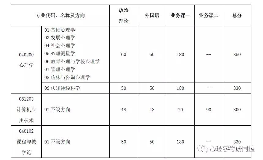 考试科目:①101思想政治理论(满分100分)、②204英语二(满分100分)、③347心理学专业综合(满分300分)
