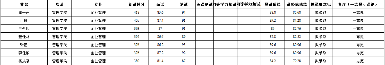 19企业管理专业报名91人,进入复试14人最低分360,最高分418;录取7人