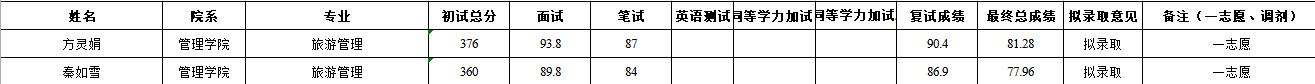 19旅游管理专业报名31人,进入复试3人最低分348,最高分376;录取2人