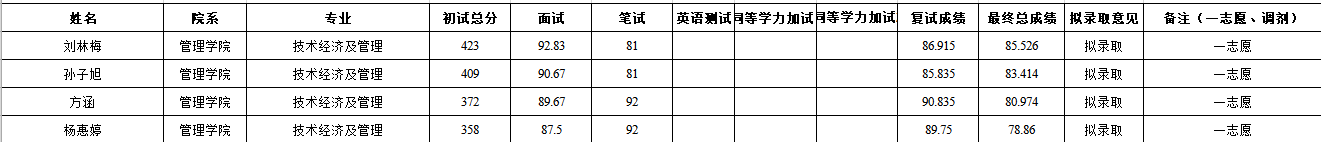 19技术经济及管理专业报名24人,进入复试7人最低分349,最高分423;录取4人