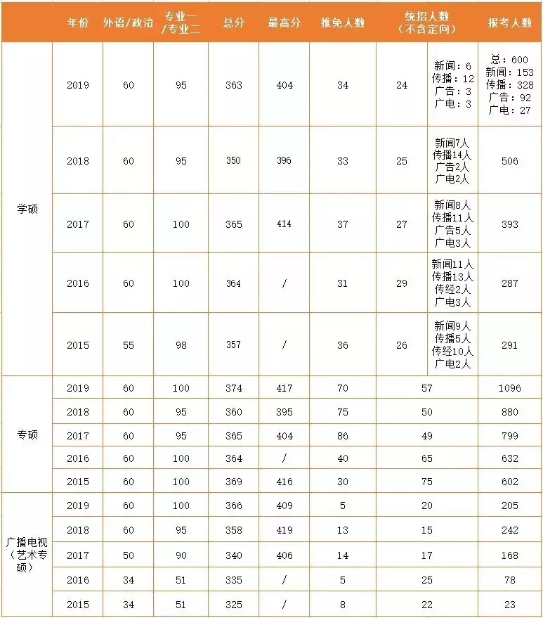 摘要:本文由新祥旭考研吴老师为大家详细解析暨南大学新闻传播学考研情况,主要有以下几个板块:暨南大学新闻传播学考研考试科目、研究方向介绍、本专业近3年复试分数线对比、本专业近3年报录比情况、本专业考研参考书目、往年录取名单及暨南大学备考经验。 一、暨南大学新闻传播学考试科目 招生院系:新闻与传播学院 招生专业:新闻学(050301) 研究方向: 01(全日制)新闻传播理论 02(全日制)新闻传播史 03(全日制)新闻传播业务 04 (全日制)传媒法制与伦理 05(全日制)舆情与危机传播 招生专业:传播学(050302) 研究方向: 01(全日制)媒介文化与媒介批评 02 (全日制)网络与新媒体 03(全日制)传媒经济学 04(全日制)传媒社会学 05 (全日制)海外华文媒体与国际传播 考试科目: ①101思想政治理论 ②201英语一 ③707新闻传播史论 ④809新闻传播业务 复试科目: 新闻学、传播学:新闻传播学综合(笔试+面试) 同等学力加试科目: 新闻学、传播学:①大众传播学 ②新闻写作 三、暨南大学新闻传播学考研参考书(仅供参考) 707新闻传播史论 李良荣:《新闻学概论》 复旦大学出版社 郭庆光:《传播学教程》 中国人民大学出版社 丁淦林:《中国新闻事业史》 高教版 张允若:《外国新闻事业史教程》 高教版 董天策:《网络新闻传播学》(第三版) 福建版 蔡铭泽:《新闻传播学》(第三版) 暨南版 支庭荣:《外国新闻传播史》暨南版(主要看张允若老师的书) 刘家林:《中国新闻通史》武大版(主要看丁淦林老师的书) 809新闻传播业务 蔡雯:《新闻编辑学》(第二版) 人大版 丁法章:《新闻评论教程》(第四版)复旦版 李岩:《广播电视新闻学》 高教版 薛国林:《当代新闻写作》暨南版 林如鹏:《新闻采访学》 暨大版 崔银河著:《广告学概论》 中国传媒大学出版社 周胜林等:《当代新闻写作》 复旦版(主要看薛国林老师的当代新闻写作) 杨先顺等:《广告文案写作原理与技巧》(第二版)暨南版 李苗、王春泉:《新广告学》 暨南大学出版社 董天策:《新闻公关广告之互动研究》 暨南版 四、2019暨南大学新闻与传播学院复试方案
