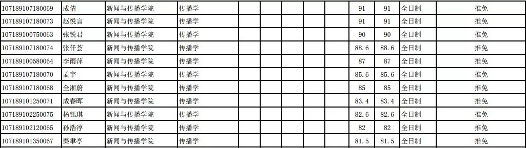 摘要:本文由新祥旭考研吴老师为大家详细解析陕西师范大学新闻传播学考研情况,主要有以下几个板块:陕西师范大学新闻传播学考研考试科目、研究方向介绍、本专业近3年复试分数线对比、本专业近3年报录比情况、本专业考研参考书目、往年录取名单及陕西师范大学备考经验。 一、陕西师范大学新闻传播学考试科目 招生院系:新闻与传播学院 招生专业:新闻学(050301)(学硕) 研究方向: 01新闻理论 02新闻史 03新闻实务 04比较新闻学 招生专业:传播学(050302)(学硕) 研究方向: 01传播理论 02网络与新媒体 03出版与文化产业 04广告学 考试科目: ①101 思想政治理论 ③710 新闻传播理论与历史 ④811 新闻传播实务 二、国家线文学类(A类)分数线 年份 政治 外语 专业课一 专业课二 总分 2019 51 51 77 77 355 2018 55 55 83 83 345 2017 53 53 80 80 345 2016 53 53 80 80 350 2015 52 52 78 78 345 陕西师范大学新闻与传播学院录取情况 年份 报考人数 录取人数 推免 最高分 最低分 平均分 2018 899 129 33 413 337 371 2017 767 118 25 411 338 375 2016 669 119 13 422 308 379 三、陕西师范大学新闻传播学考研参考书(2018官方指定) 710 新闻传播理论与历史 李良荣:《新闻学概论》(第四版),复旦大学出版社2011年版 郭庆光:《传播学教程》(第二版),中国人民大学出版社年2011年版 方汉奇:《中国新闻传播史》,中国人民大学出版社2009年版 杨保军:《新闻理论教程》(第二版),中国人民大学出版社2010年版 811 新闻传播实务 刘海贵:《中国新闻采访写作教程》,复旦大学出版社2008年版 张子让:《当代新闻编辑》,复旦大学出版社2004年版 丁法章:《新闻评论教程》,复旦大学出版社2008年版 四、2019陕西师范大学新闻传播学学硕复试名单 专业 名称 姓名 总分 政治 理论 外国 语 业务课 一 业务课 二 新闻学 宋佳 374 70 60 134 110 新闻学 罗志芳 372 69 75 116 112 新闻学 高雨卉 370 70 73 110 117 新闻学 李芳 366 71 68 113 114 新闻学 刘希瑶 363 71 73 105 114 新闻学 蒙少华 358 68 56 120 114 新闻学 李怡萱 358 64 74 108 112 新闻学 白紫璇 357 80 59 109 109 传播学 贾静静 387 75 67 126 119 传播学 刘育青 378 72 70 122 114 传播学 姚子悦 376 74 76 116 110 传播学 李洁 372 74 58 127 113 传播学 张思雨 371 64 72 130 105 传播学 张静雯 370 66 73 120 111 传播学 成杰 369 69 65 121 114 传播学 弓亚男 364 70 71 114 109 传播学 刘怡 362 67 65 119 111 传播学 李丹雅 361 66 70 122 103 传播学 吴璇 357 68 68 110 111 传播学 王谭 356 67 55 122 112 传播学 张晗 356 68 67 113 108 传播学 张娜 355 65 56 131 103 2019新闻传播学学硕拟录取名单 五、陕西师范大学新闻传播学考研复习经验
