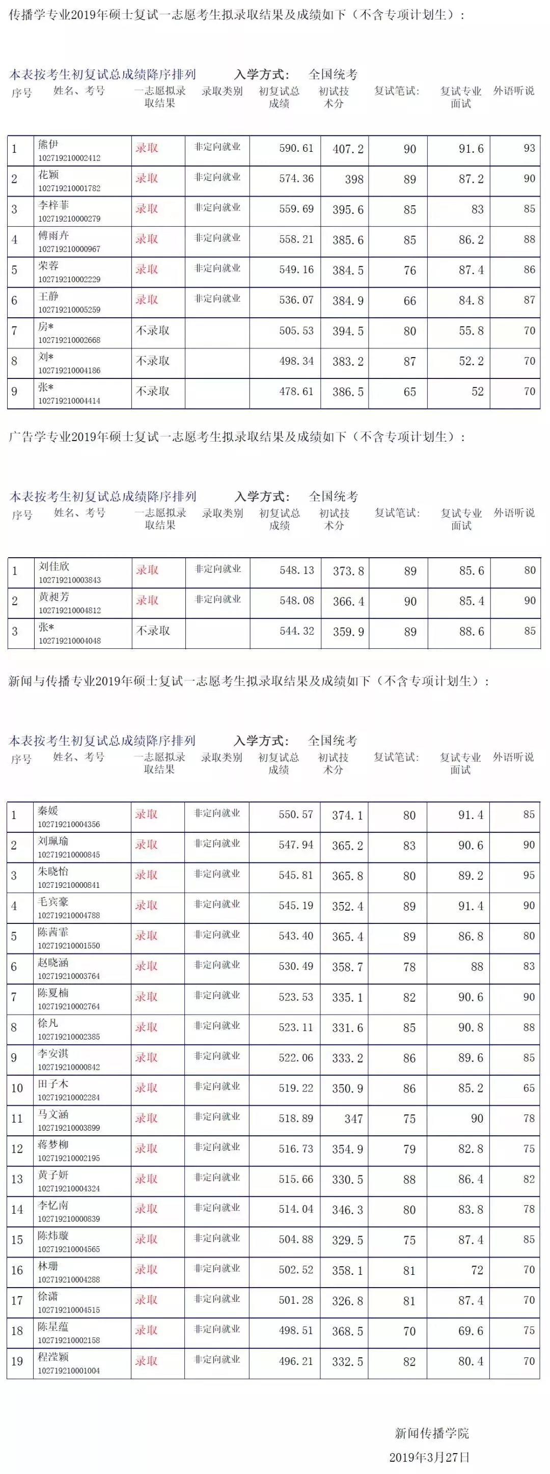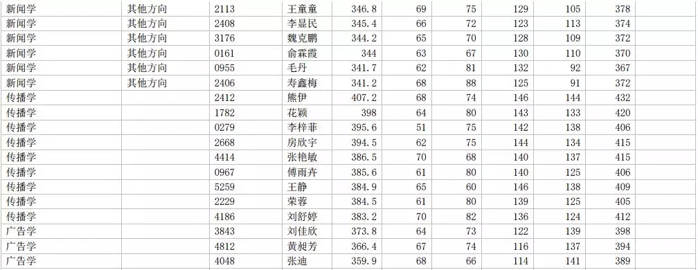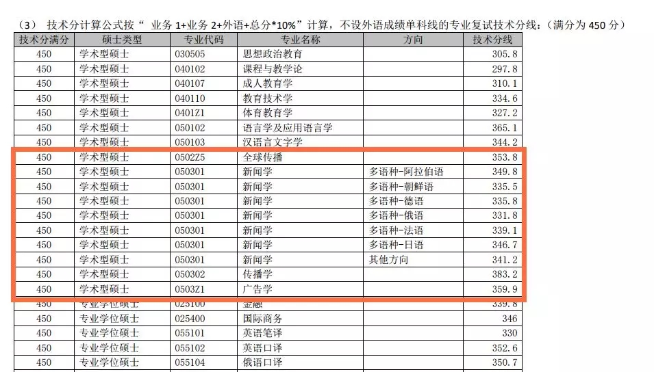 摘要:本文由新祥旭考研吴老师为大家详细解析上海外国语大学新闻传播学考研情况,主要有以下几个板块:上海外国语大学新闻传播学考研考试科目、研究方向介绍、本专业近3年复试分数线对比、本专业近3年报录比情况、本专业考研参考书目、往年录取名单及上海外国语大学备考经验。 一、上海外国语大学传播学考试科目 招生院系:新闻传播学院 招生专业:传播学(050302)(学硕) 研究方向: 1.人工智能广告与计算传播学 2.新媒体与全球传播 3.影视国际传播 4.跨文化传播 考试科目: ①101 思想政治理论 ③645 传播学实务 ④845 传播学理论 复试: 笔试科目名称:传播学综合 注:同等学力考生需在国家一级中文核心学术期刊(CSSCI)上发表两篇及以上与报考专业相近或相关的学术论文。(同等学力考生指高职高专毕业生或本科结业生,本科毕业生或应届本科生不属于同等学力,正常报考即可,无以上要求。) 二、国家线文学类(A类)分数线 年份 政治 外语 专业课一 专业课二 总分 2019 51 51 77 77 355 2018 55 55 83 83 345 2017 53 53 80 80 345 2016 53 53 80 80 350 2015 52 52 78 78 345 上外新闻传播学录取情况 注:(能否进入复试不是取决于初试的总分,而是技术分(不看重政治的分数):专业课1+专业课2+总分*10%,在国家线基础上,上外复试采取差额比例按照 120%-200%按照技术分的排名选拔一定的学生进入复试) 2019上外新闻传播学一志愿复试分数线 三、上海外国语大学传播学考研参考书(仅供参考) 《传播理论:起源、方法与应用》 《国际传播学》程曼丽 《全球传播》叶海亚 《公共关系学》 居延安 《广告英语》张祖忻 《跨文化交际》 林大津 复试参考书目(官方指定): 《传播理论:起源、方法与应用》(第五版),沃纳•赛佛林 (werner J.sevenin), 坦卡德,中国传媒大学出版社,2006-1-1。 四、2019上海外国语大学传播学学硕复试名单 2019传播学学硕拟录取名单 五、上海外国语大学传播学考研复习经验