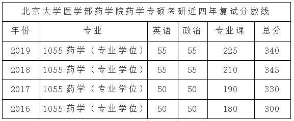 四、北京大学医学部药学院药学专硕考研近四年复试分数线: