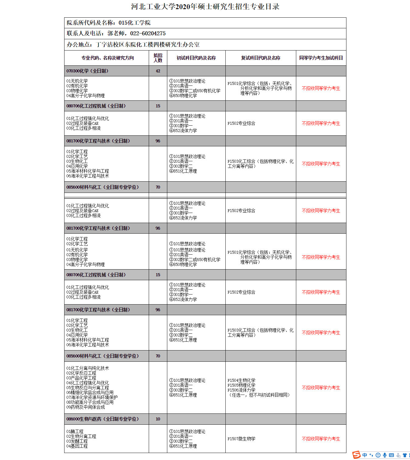 河工大考研辅导班:2020年河北工业大学化工学院专业目录