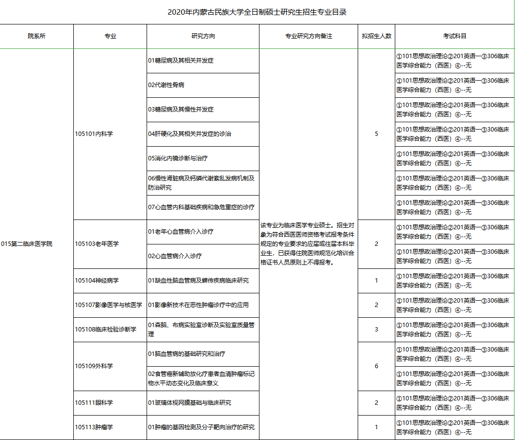 内蒙古大学考研辅导班:2020年内蒙古大学第二临床医学院考研专业目录