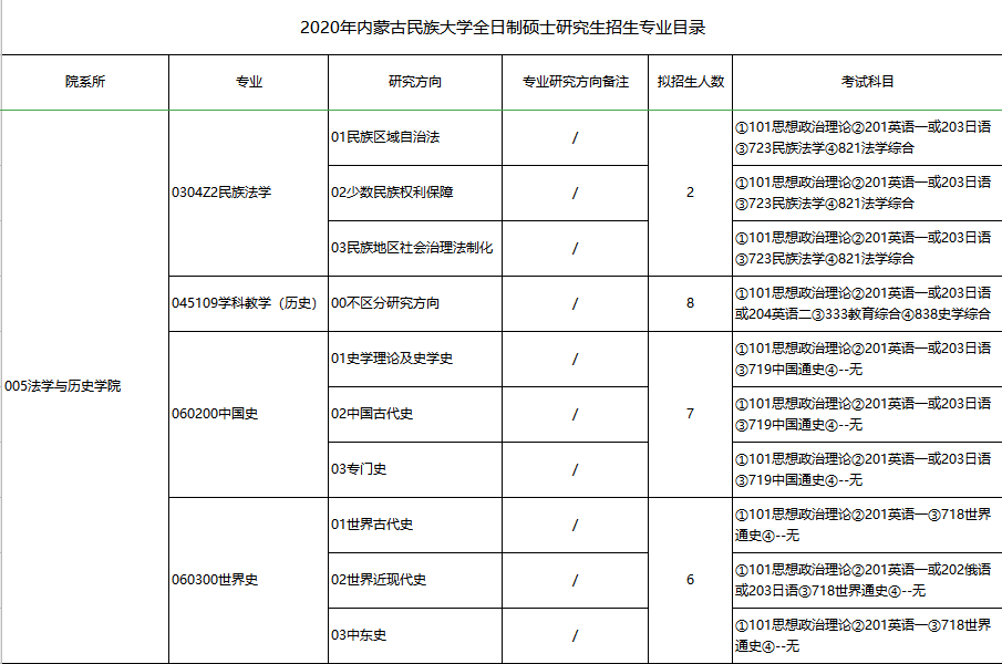 内蒙古大学考研辅导班:2020年内蒙古大学法学与历史学院考研专业目录