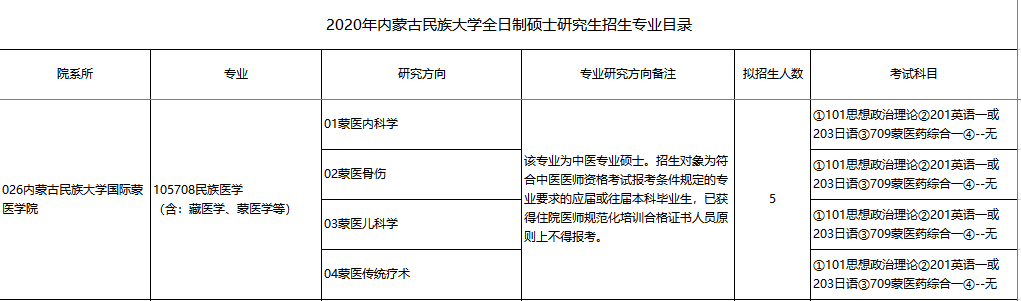 内蒙古大学考研辅导班:2020年内蒙古名族大学国际蒙医学院考研专业目录