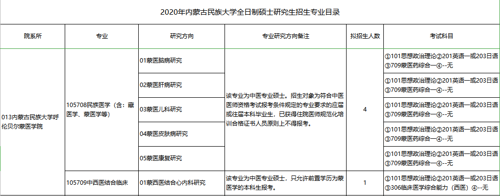 内蒙古大学考研辅导班:2020年内蒙古名族大学锡林郭勒蒙医临床学院考研专业目录