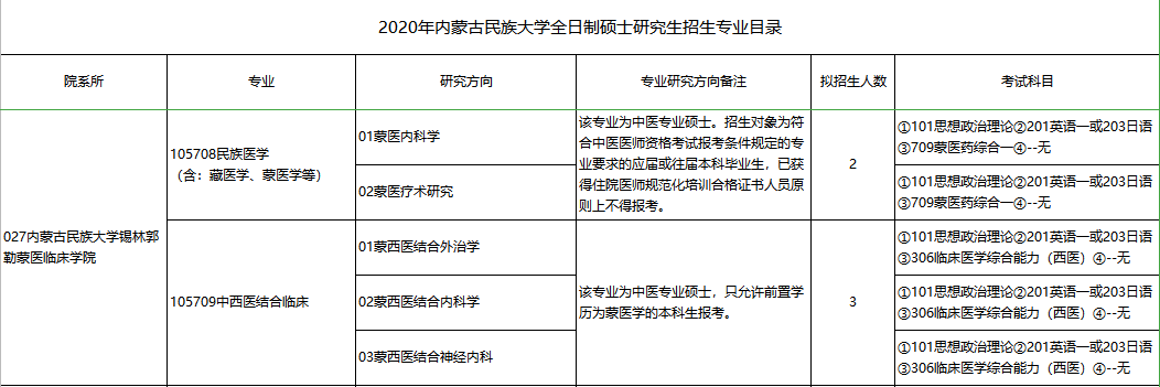 内蒙古大学考研辅导班:2020年内蒙古名族大学锡林郭勒蒙医临床学院考研专业目录