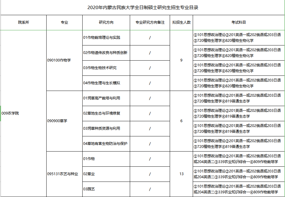 内蒙古大学考研辅导班:2020年内蒙古大学农学院考研专业目
