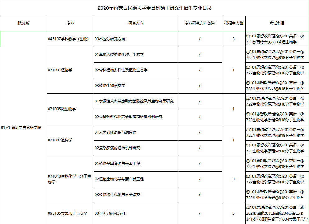 内蒙古大学考研辅导班:2020年内蒙古大学生命科学与食品学院全日制研究生专业目录